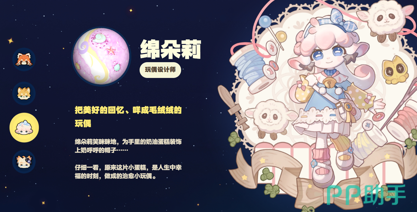 绵朵莉是一位粉色小羊拟人角色,担任玩偶设计师一职。她性格柔和,富有创造力,能将日常点滴转化为独特的毛绒手工艺品。所制作的玩偶不仅可用于装饰空间,还可作为商品出售以增加收入来源,兼具实用与情感价值。