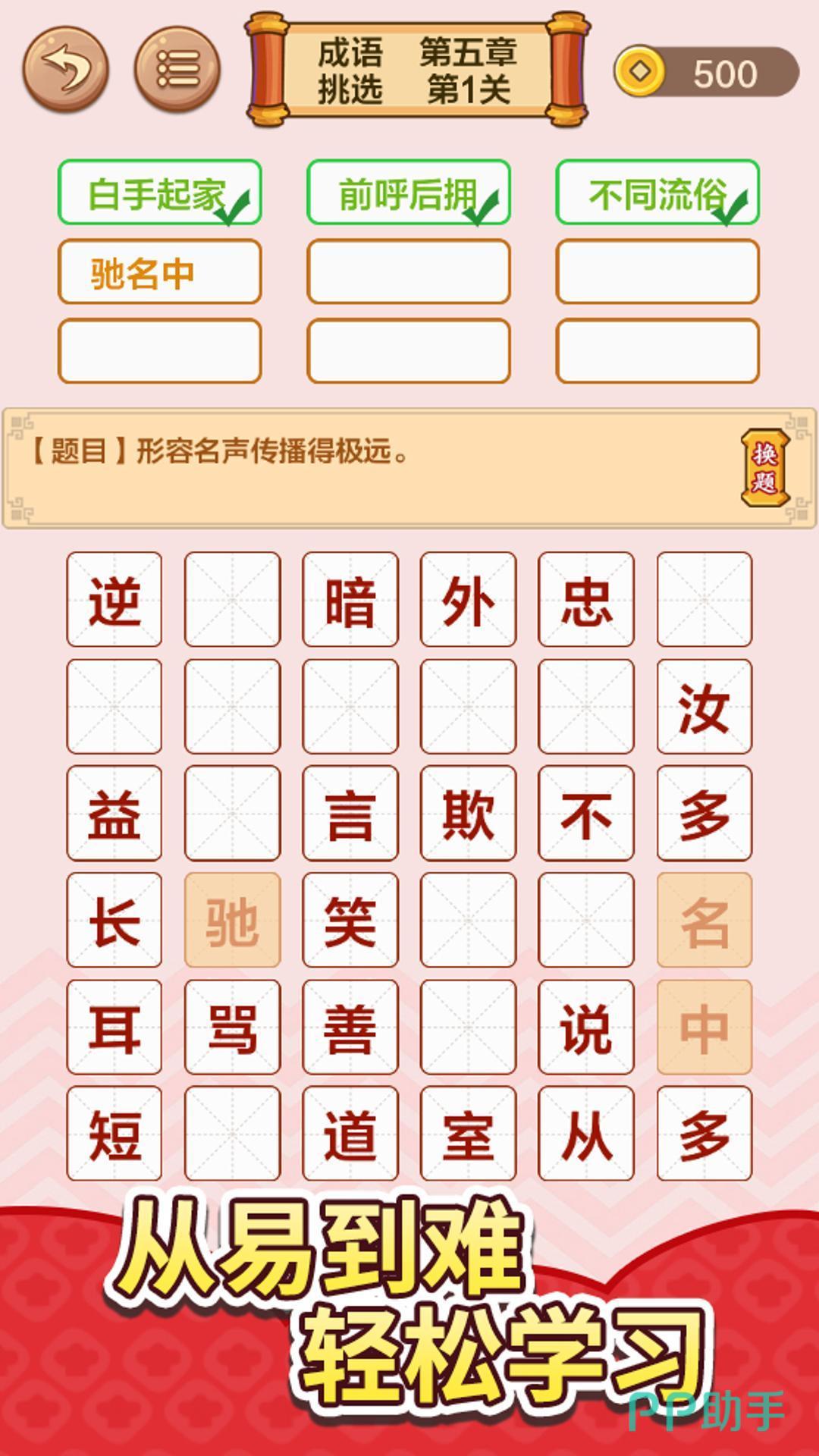 《成语大接龙》按照难易程度划分等级,循序渐进地引导玩家提升水平。游戏中设置多种隐藏任务,需要从混乱字阵中挑选合适词语完成拼接。整体沿用经典的首尾相连规则,操作直观,挑战性强,适合希望系统化训练成语能力的用户。