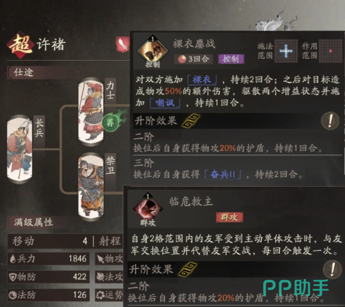 此外,许褚的“临危救主”技能可在队友受到主动单体攻击时,与其交换位置并代为承受攻击,实现援护与站位调整的双重作用。该技能升至2阶后,还能为自己附加护盾,进一步增强生存能力,适合用于保护核心输出单位。