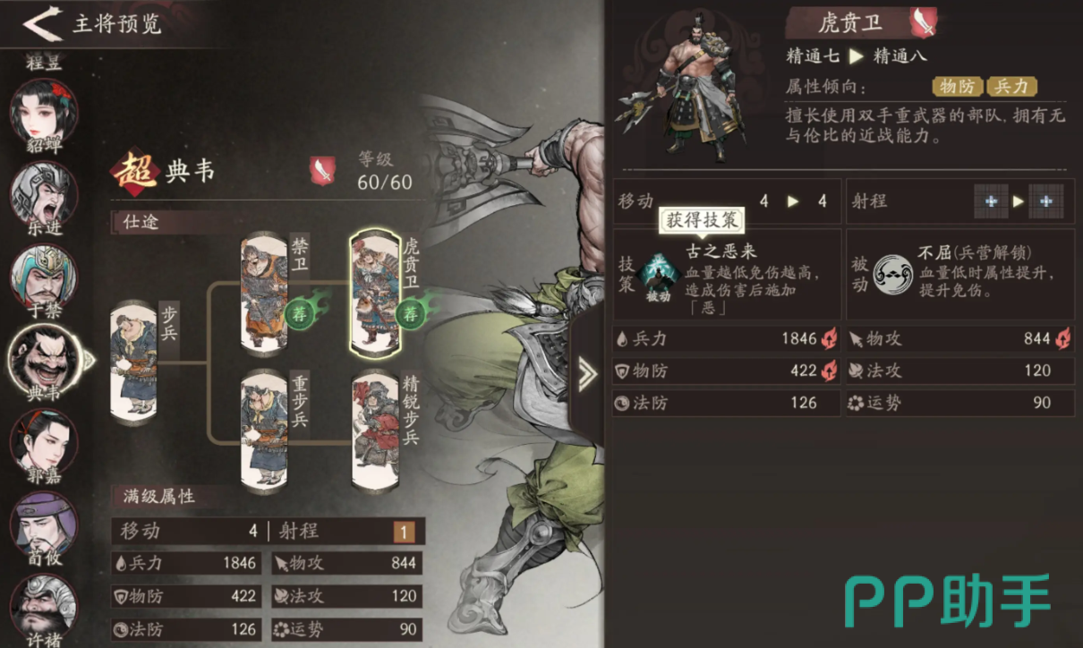 典韦的“折冲御敌”技能允许他替相邻友军分摊20%所受伤害,并提升自身移动力与10%吸血效果。技能升级后,还可使范围内队友受到的伤害减少10%,显著增强了团队承伤能力。