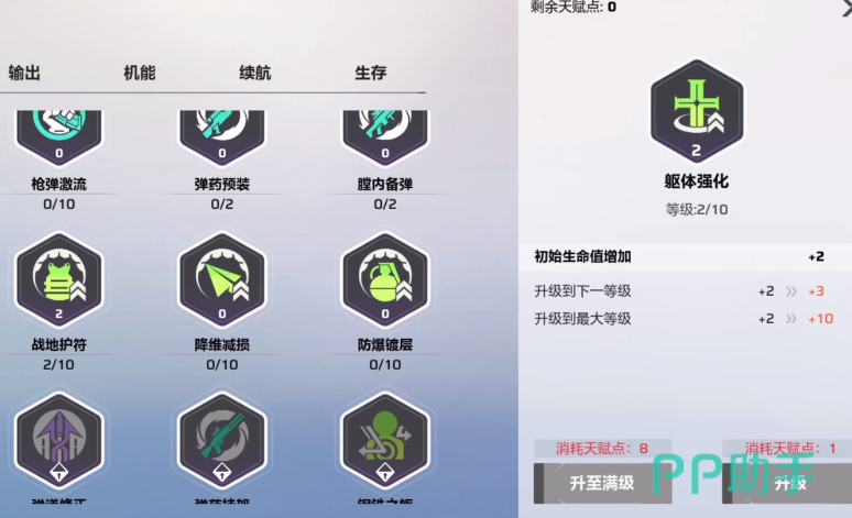 游戏中的天赋体系共划分为四大类别:增强基础战力、优化技能效果、提升持续作战能力以及加强生存防御性能。每位角色的职业定位不同,所需侧重的加点方向也有所差异。例如,若使用的是输出型角色,则应优先考虑提升护盾强度与射击精准度,从而在交火中占据优势地位。