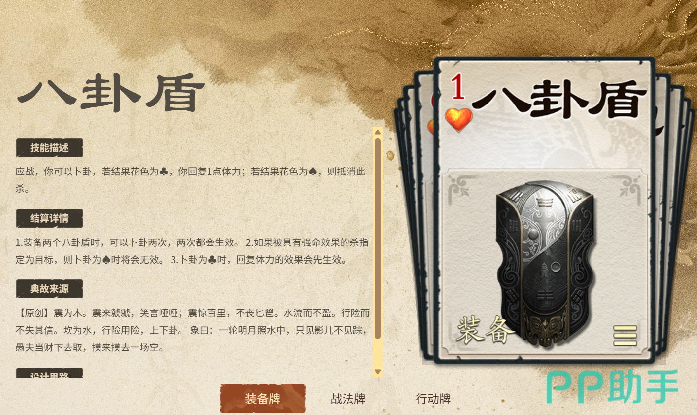 接下来是经典的防御核心——八卦盾。其核心机制基于卜卦判定系统:当受到【杀】攻击时,有一定概率抵消伤害;若判定结果为红色花色,还能额外回复一点体力。这种不确定性使得八卦盾在危急时刻常有“逆境翻盘”的表现。若同时装备两张八卦盾,则可进行两次独立判定,防御叠加效果显著,成为偏好防守流派武将的理想选择。但需注意,面对如“强命杀”这类无视防具的特殊攻击时,八卦盾将无法生效。