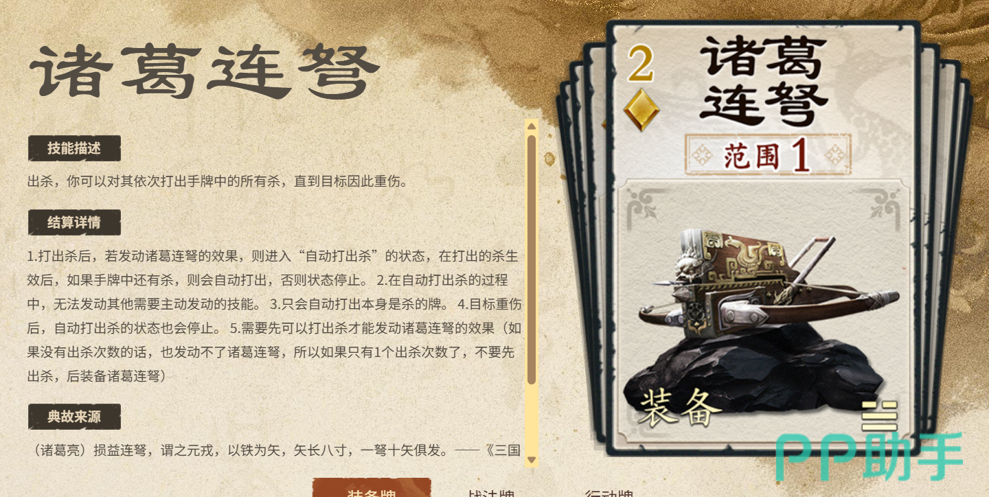 此外,一些以进攻见长的装备同样具备间接防御作用。例如轩辕剑和诸葛连弩,虽主要定位为武器,但在特定情境下也能强化自身防线。轩辕剑赋予使用者贯穿与封禁效果的【杀】,不仅能高效压制对手,还可限制敌方技能释放,从而降低被反击的风险。而诸葛连弩凭借“连射”特性,可在短时间内打出高频输出,迅速击破敌方防具体系。其“自动出杀”机制在多目标战斗中尤为强势,一旦触发几乎令对手难以招架。