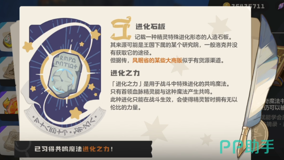 进化之力属于主线任务中的核心奖励道具。玩家需先在游戏中获取“远古魔法摘录”,这一物品将引导你掌握御三家精灵对应的血脉魔法。随后前往地图中的风眠省寻找NPC安妮,通过支付一定数量的金币购买石板,即可正式获得进化之力。同时,完成此项交易还能解锁三项血脉之力任务,完成后可习得三个实用技能,为后续挑战提供有力支持。
