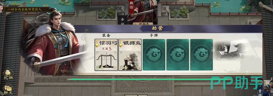 第32关:此关操作较为简便,选择吕雉作为主将。官方建议使用【调兵遣将】将刘邦手中的惊羽弓借取并装备,这样本回合打出的第一张杀具备强制命中效果,可直接击杀韩信完成任务。若未持有该锦囊,则可通过【破阵卸甲】配合【调兵遣将】移除对手两张闪牌,再打出杀牌实现突破。