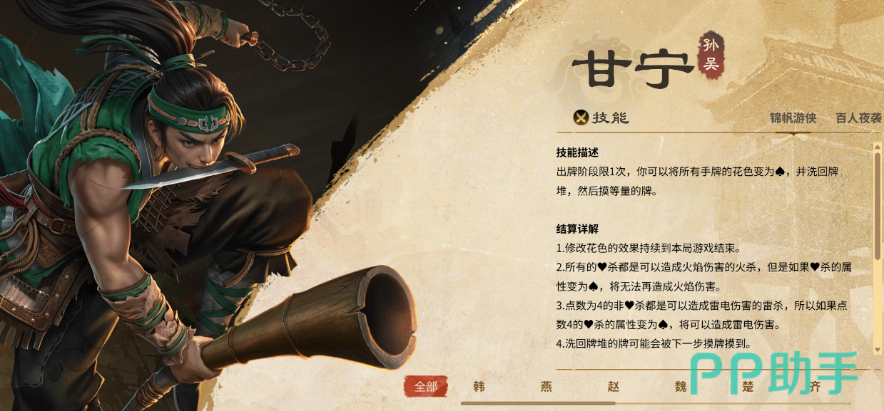 该玩法的核心武将为甘宁,其关键技能“奇袭”拥有直接弃置敌方手牌或装备的能力,能够在短时间内大幅削减对方战斗力。尤其是在对手持有高价值装备或关键响应牌时,使用得当可瞬间打破局势平衡,形成压制效果。这一技能不仅具备资源掠夺性,还能打乱敌方出牌节奏,是推进战术执行的重要保障。