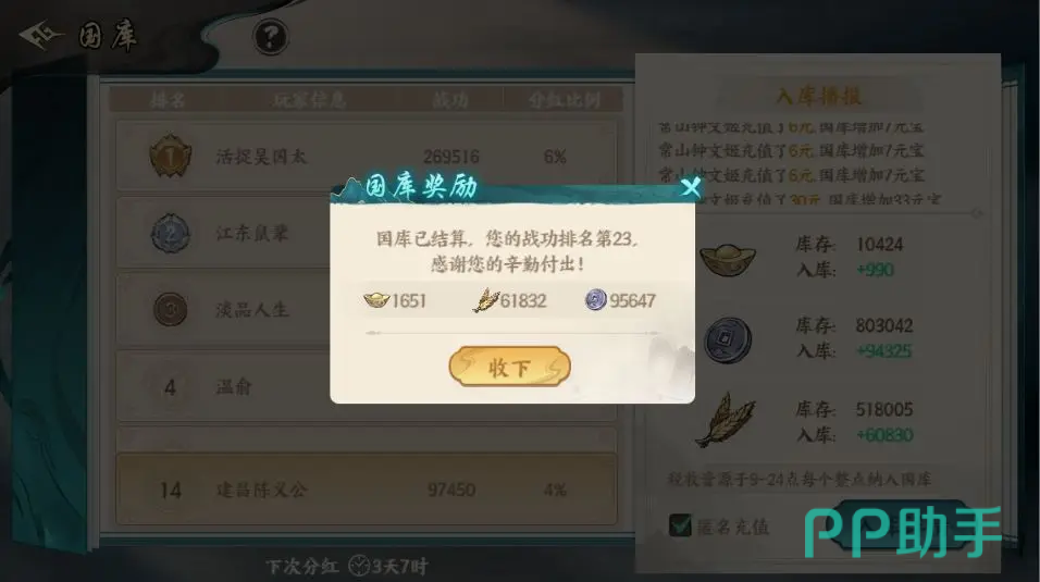 每四天会进行一次分红结算,会根据本国成员的战功排名,用邮件发放分红的奖励。