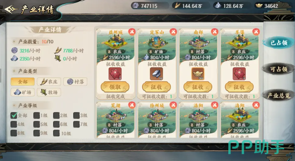 每人可以占领10个产业,包括农庄、矿场、村落、牧场等,每个小时会提供对应资源产出,可储存8h。