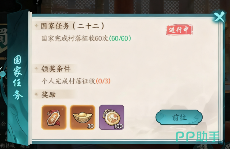 任务分为国家和个人,需要同时满足双方的条件才可以领取奖励。