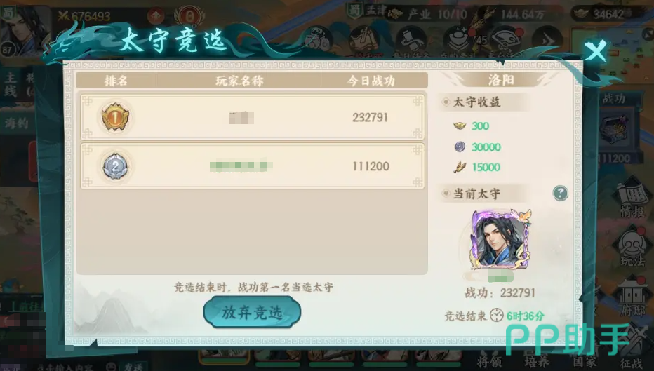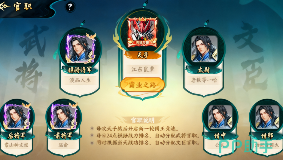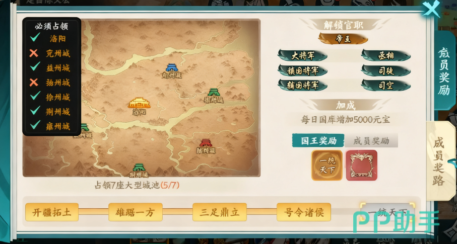 城池太守:在主城、皇城、州城以及关口,每天都会发起竞选,当日参选并获取战功排名最高的担任太守。