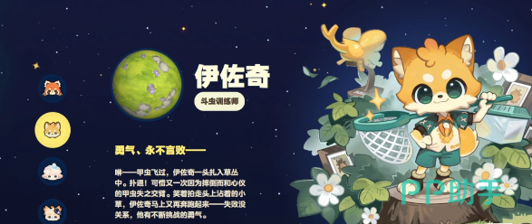 伊佐奇:这就是一个男性角色,如果从定位来看,那这就是一个斗虫训练师。性格是比较积极乐观的,一直都会拥有着冒险的精神,始终都会认为永不言弃才是成功的关键。在捕捉稀有甲虫这一方面,始终都拥有着大家不敢想象的热情。从外观来看是浅黄色的狐狸经常性都会穿着蓝绿色的运动装,整体来看就会有一种青春活力,所以不少的人还是很喜欢的。