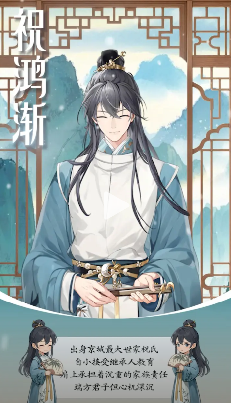 祝鸿渐:是一个温润如玉的工资外观,走的一个富家公子类的路线,出现的时候手中经常出现一把扇子,看起来性格温和,他也是出身于京城当中最大的一个世家祝氏,他从小接受的是继承人教育,所以是很有心计的,肩上承担着沉重的家族责任但是对外展现的还是一个端方君子星象,跟随剧情发展,大家就会知道这个角色后期的心机深沉了,前期跟女主角接触的时候大部分都是以一个好人的身份出现,在女主角遇到渣男的时候他也会帮忙,后期就会展露自己的心计帮助女主角前进。