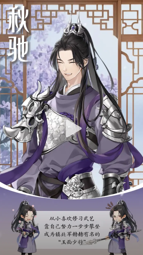 秋驰:是一个武将路线的角色,这个角色出现的时候是走的武艺路线,身着服饰也是有盔甲以及各类护手类的元素,性格上面比较洒脱,跟女主角秋婉是亲人的关系,因为秋婉要经营茶楼,所以秋驰也会经常到茶楼当中帮忙,所以剧情占比也比较重,出现的时候经常是作为一个保护者的姿态,女主角对于他的好感度初始就很高,他人设当中从小喜欢修习武艺,后面更是靠自己努力一步步成为镇北军赫赫有名的一位玉面少将,也是颜值跟人气都很高的NPC。