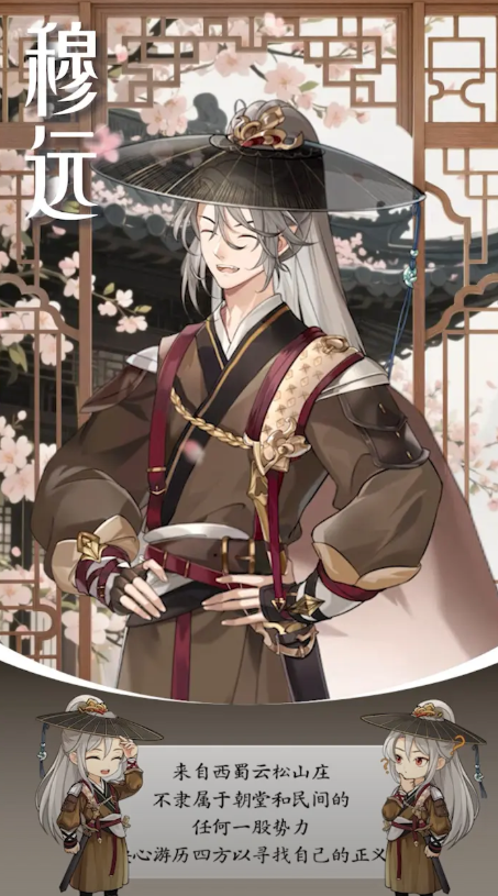 穆远:可以说是新手时期最快接触的一个男性角色,在剧情中他晕倒在茶楼后巷当中,被女主角救起来,游戏中的穆远是一个侠客的人设,原本是来自西蜀云松山庄,后来被救之后就留在了茶楼,也跟女主角有部分感情线可以发展,他不隶属于朝堂和民间的任何一股势力,所以很多需要打渣男的剧情当中,会有穆远的出现,但是他的性格非常崇尚自由,愿意游走四方寻找自己心中的正义,所以看起来非常有侠义心肠,外观当中也有类似大侠风的装饰。