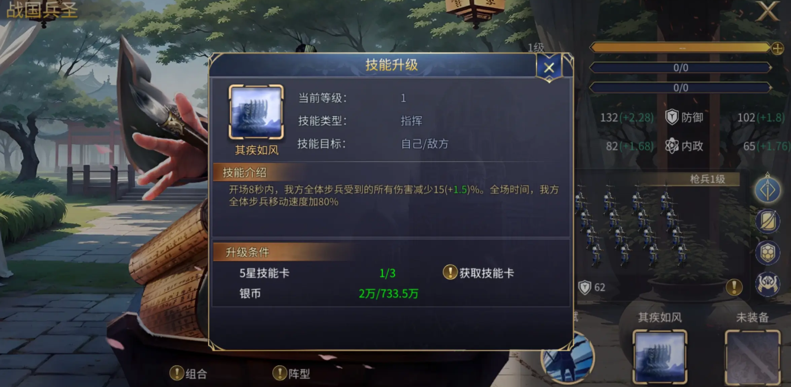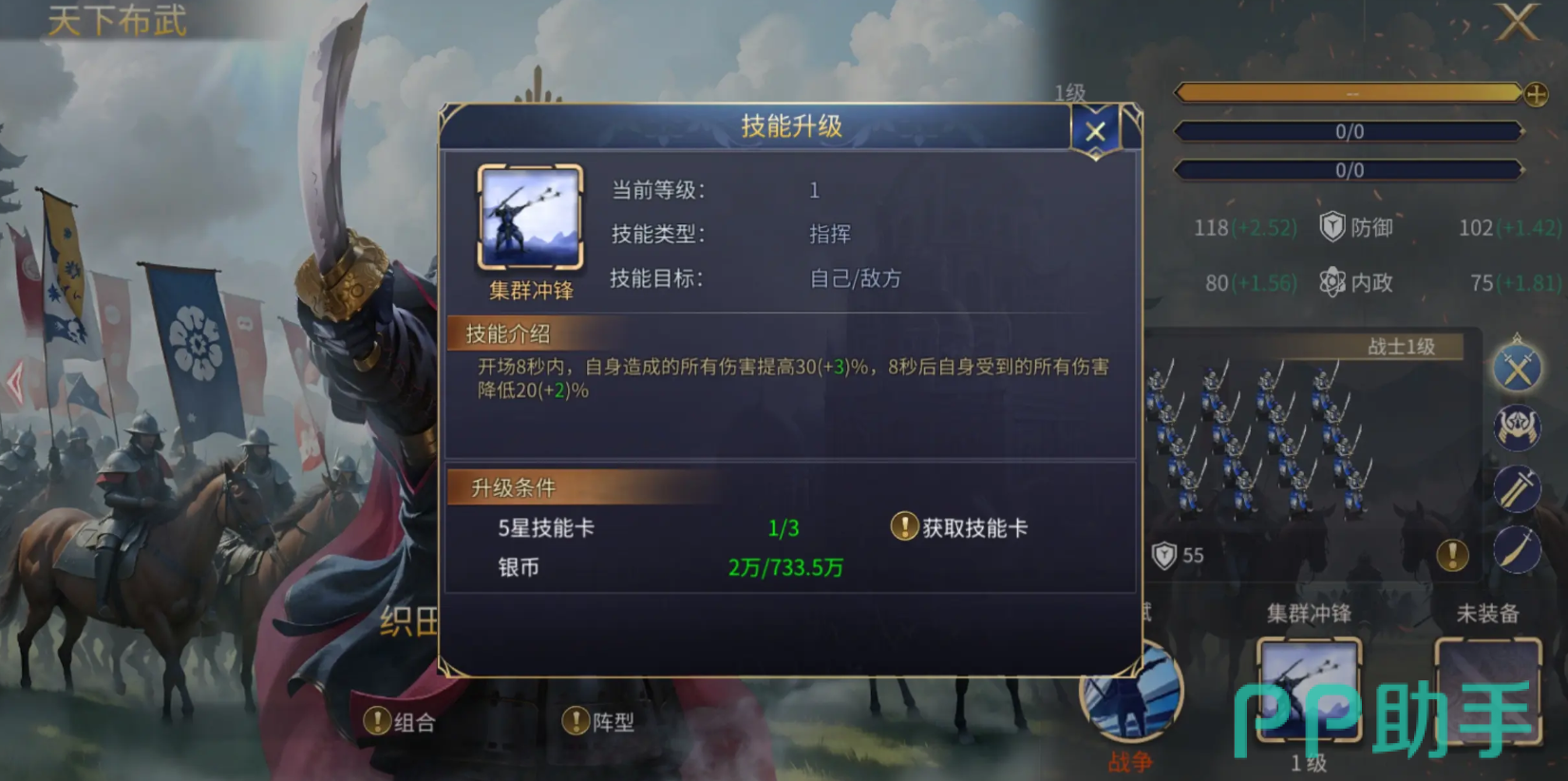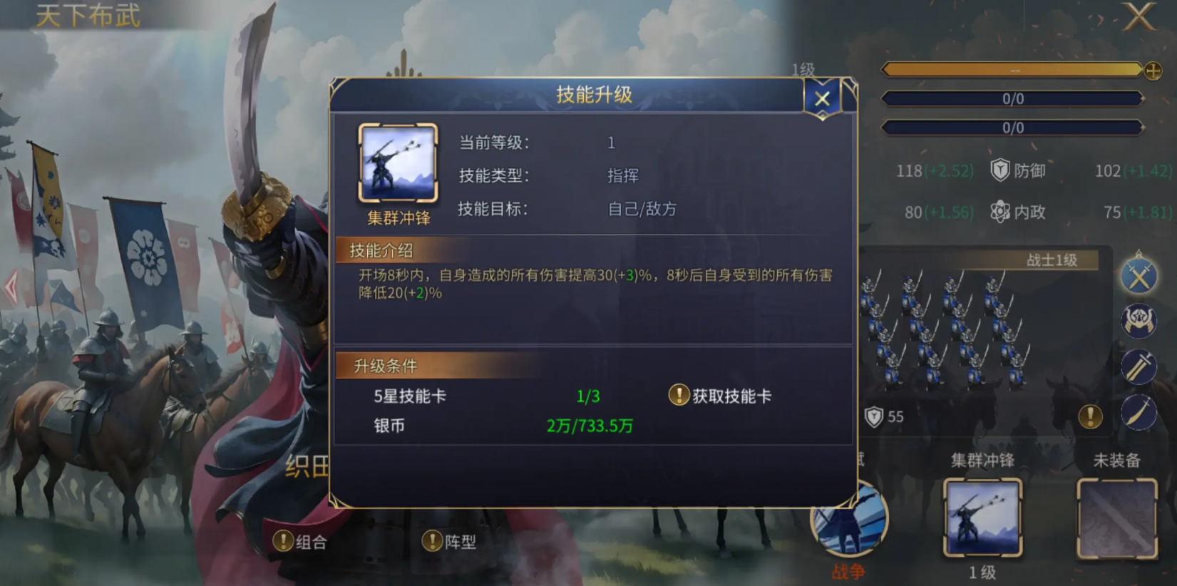 作为一名专注于自身强化的步兵英雄,天下布武在开场8秒内大幅提升输出能力,之后转为减伤模式。满级状态下,伤害提升可达57%,后续受到的伤害降低38%。凭借武士兵种特性,他能在前8秒完成三次飞矢攻击,迅速压制对手。后期生存能力也极为出色,适合与孙武协同出战,形成攻守兼备的步兵前排组合。