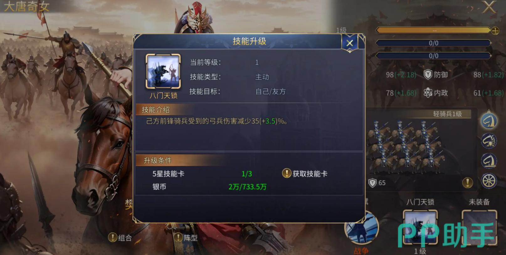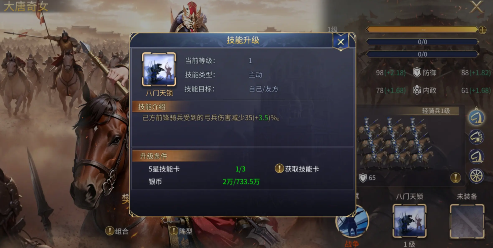 霍去病的核心价值在于强化侧翼部队的机动性与抗打击能力。其技能可使所有侧翼步兵移速提升80%,并让全队骑兵在前三次受到的远程伤害减少66.5%。这一特性特别适用于尖刀阵型,能有效保护突进单位,增强切入成功率,是应对敌方远程压制的优选英雄。