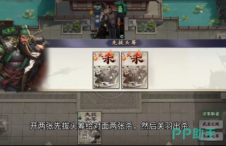 第12关:起手阶段先向敌方传递两张【杀】牌,确保关羽能够立即响应并发动出杀动作,借此激活其“万军取首”的增伤被动,大幅提升单次伤害值,轻松完成斩杀目标。