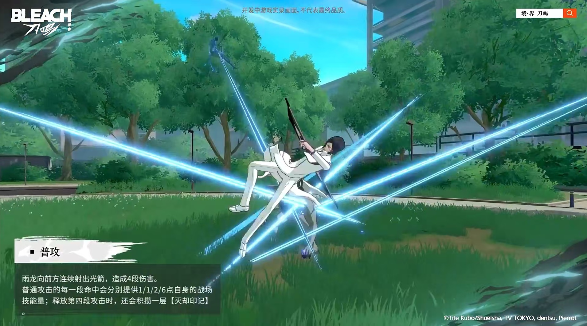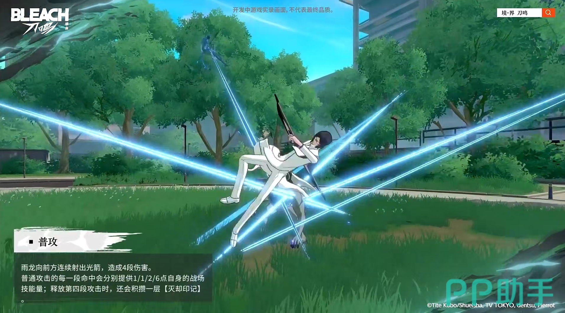 石田雨龙的基础攻击方式为向前方连续射出多支光箭,造成多段打击伤害。每次命中敌人都会为自己积累能量,且在第四段普攻时额外获得一层印记。他的战斗技能需短暂瞄准后释放,向前方发射一连串箭矢,对目标区域敌人造成伤害并叠加印记,同时命中单位时可恢复自身能量值。必杀技则是在指定范围内进行持续性箭雨覆盖,施加范围伤害,并使被击中的敌人累积一层印记效果。