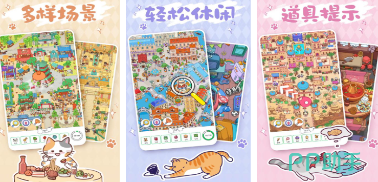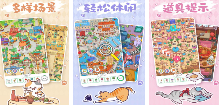 疯狂找东西设定在一个充满童趣的猫咪世界中,主打场景寻物玩法。游戏中包含多个精心绘制的场景,如绿意盎然的公园、阳光洒落的海滩等,每个画面都隐藏着若干指定物品。玩家需仔细观察,找出所有目标才能解锁下一关卡,在轻松节奏中锻炼专注力与眼力。