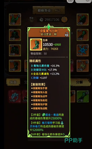 核心的套装那自然就是绿魔暗蚀六件套。这一个装备就会拥有高额毒属性的加成,可以让毒素伤害直接翻倍,而且还可以延长中毒持续的时间,搭配毒属性技能之后,那敌人就会一直掉血。而且六件套的套装效果,还可以迅速的提升自身的暴击率,拥有持续伤害以及爆发输出的优势。新手只要凑齐这一套,那就可以马上打下坚实的基础。从武器选择上来看,也并不需要过于的纠结,可以选择无念一闪或者是龙牙。