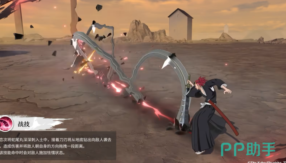 恋次降蛇尾丸深深的刺入土中,接着刺入土中的刀刃将会直接从地底下钻出来并且朝着敌人袭击,造成伤害的同时还能将敌人朝着自身的方向给拖拽一段距离,该技能一旦命中对手也能附加上怯懦的状态。