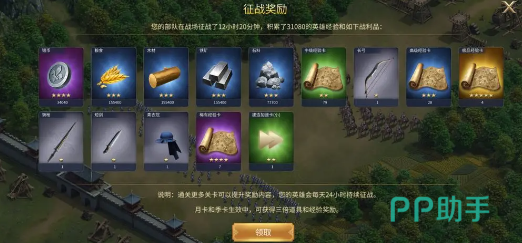 名将挑战其实就等同于常驻副本总共有630关,没有时间的限制。当然要想成功,那就需要看队伍的真实力,毕竟英雄的等级还有卷轴的加成都会影响到最后的表现。不需要特意的留着英雄去轮换同一个英雄也可以重复的上阵,所以可以选择放心搭配。奖励方面对开荒人员来说是一个福利。在通过指定关卡之后,可以领取皇家征召令。还有良心的征战奖励,只要通关过的关卡系统在24小时内都会让英雄持续的征战,那么此时就会获得源源不断的实用道具。