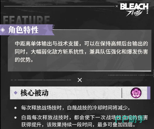 朽木白哉属于一个战术型的斩系角色。核心的优势在脱手输出,还有队伍强化两大维度上。战场技能可以直接造成钉地控制,而且还会形成伤害。在叠加印记之后,能迅速的降低敌人的抗性,让队友的输出效率直接翻倍。被动技能的设计让他并不需要全程在场,在后台的状态下也能自动的提升伤害。战斗技能和战场技能会彼此之间相辅相成。释放战场技能还可以持续的减少战斗技能冷却。最高4层叠加机制,可以让输出循环变得越来越猛,必杀技能一旦在开启之后将强化普攻以及战斗技能。