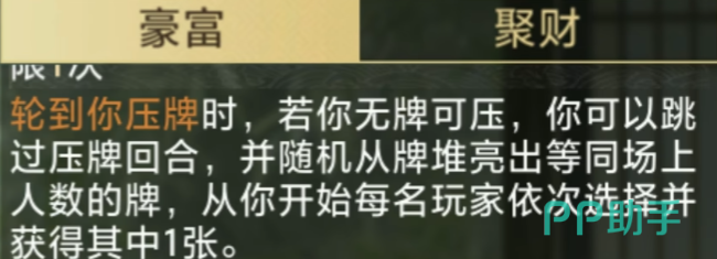 并且这里的话会按照每人的顺序来各自获取其中一张卡牌,也就是说在抽出来这几张牌里面给大家进行分配的时候,都是1:1分配的,然后这里在牌数上面,鲁肃玩家拥有的是其中最关键的一张卡牌,如果在这里大家没有使用豪富来获得这里卡牌的话,则可以通过另外的一个聚财技能来进行刷新,聚财的效果刷新了这个技能之后,也可以提高后续鲁梭的整体应变能力,在大家无牌可出的时候,就可以利用鲁肃的这个技能带来更多的出牌效果。