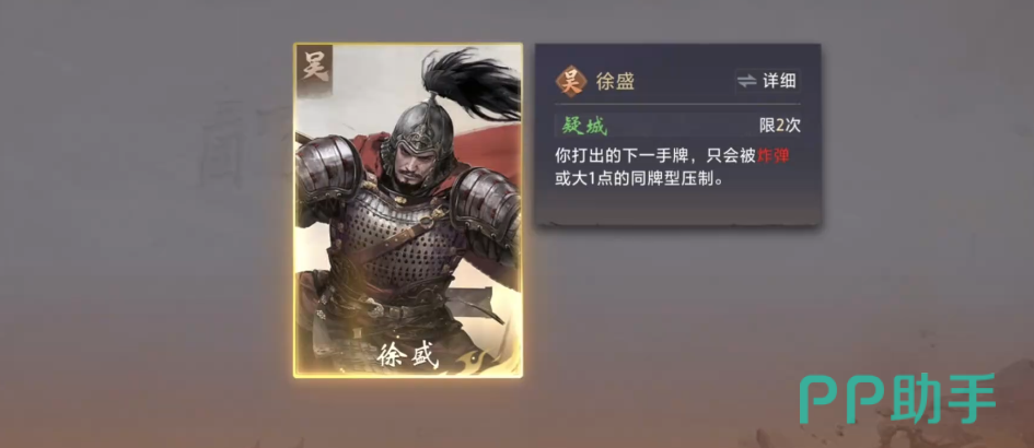 徐盛的效果上面有一个疑城的技能,这个技能虽然在使用上限上面也只限两次,但是大家使用他在对局当中打出来的下一个手牌就会上一只炸弹,此时或者是有大一点的同牌星压制的情况下,他的这个技能效果就会变得非常好用,而且游戏当中大家用徐盛的话要注意他的出手概率,目前利用这个效果的话,他的出手概率还是非常高的,不过大家要有徐盛的话,要注意在开局阶段他的技能效果是否要使用,因为他的技能在大局已定的时候使用效果会比较好。