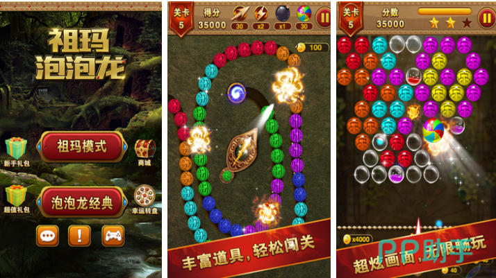 祖玛泡泡龙是款超级经典的双重玩法消除闯关游戏,一颗颗小球球会排列整齐向着终点进发,在这些小球抵达终点之前大家要将其全部消除,说实话这款手游没啥难度也有着怀旧向的画面,仅需点击屏幕不同地点就能进行射击消除,轻松的气氛跟多样道具的辅佐让游戏可玩性增加不少,新手礼包系统也会随机分配给大家各种实用资源。