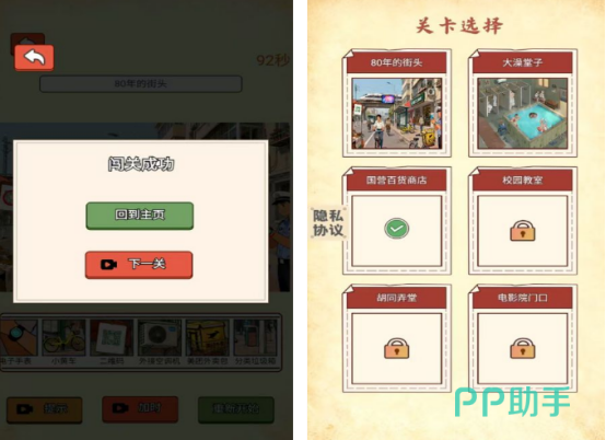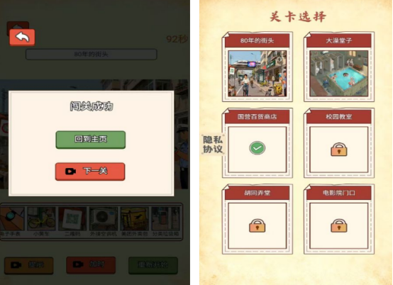该游戏融合了时代怀旧与找不同机制,玩家将在多个历史场景中寻找不符合年代特征的物品。从80年代到90年代的生活细节入手,考验观察力的同时唤起童年记忆。每一关都设计巧妙,充满幽默感,挑战过程中不仅能收获乐趣,还能重温过去的生活风貌。