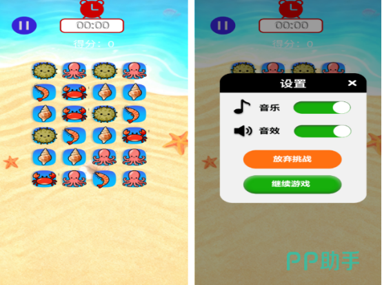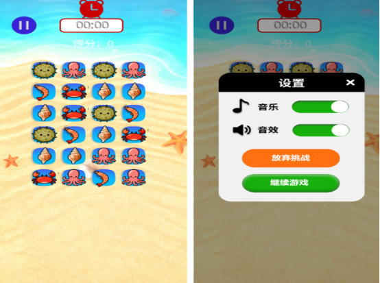 这是一款以海洋生物为主题的连连看类休闲游戏,玩家需要在限定时间内将相同的图案配对消除。游戏中出现的角色包括螃蟹、乌贼、海螺和海星等,画面清新自然,背景融入了海底世界的视觉元素,营造出沉浸式的氛围。支持开启背景音乐与音效,整体节奏轻松愉悦,非常适合放松心情。