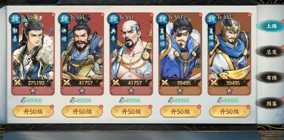 许褚+典韦+郭嘉+夏侯渊+夏侯惇这就是开荒阵容,可以有效发挥魏国寒冰的优势。夏侯淳,夏侯渊以及许褚,全部都会有寒冰的效果,可以降低目标16%的攻击,并且还会持续三秒的时间。郭嘉专门会针对寒冰目标去施加一个冰冻的控制,让对手根本就无法动弹。典韦就可以直接触发一个寒冰被动的核心技能,所以这一个阵容还是比较实在的,整体节奏比较平稳,有控制,有输出,还有铺垫。不管是一开始的刷野还是推图,其实都并不容易翻车。