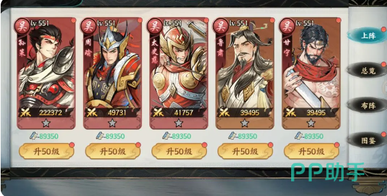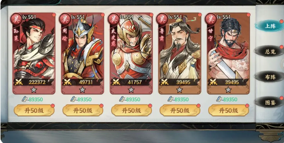 太史慈+孙策+周瑜+鲁肃+甘宁这就是吴国队的一个阵容,这个阵容主要的优势就在于有一个灼烧的效果,每一秒都会让目标失去1%的气血上限,并且持续三秒还可以叠加5层,所造成的伤害上限并不输。周瑜甘宁还有鲁肃就是灼烧效果的附加者。太史慈以及孙策就会负责触发联动打伤害,虽然吴国队会缺乏控制,但持续输出的能力还是比较出色的。尤其是国战攻打扬州时,带上周瑜的五段技能伤害,以及烧灼减气血上限的效果,就可以有效提升攻坚的效率。