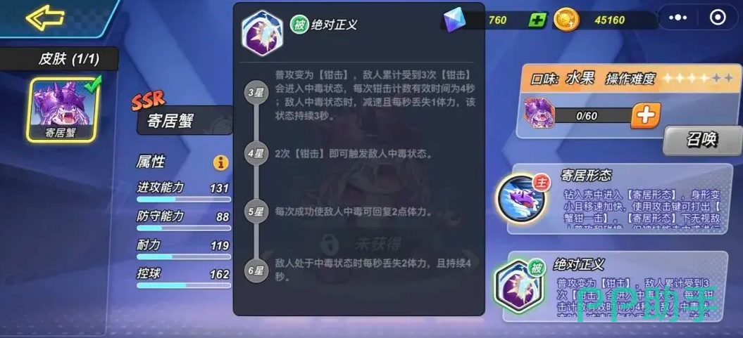 还有一点也很有意思,就是寄居蟹的被动技能【绝对正义】。它解锁了之后,三次普攻就能让敌人中毒,敌人中了毒之后会变得很慢,而且会失去一些血量,这样就能给对手带来很大的麻烦。到了四星,效果会更强,普攻两下就能让敌人中毒。虽然你可能会遇到一些高手,他们跳跃和冲刺都很厉害,可能就不容易让你触发这个技能,但还是可以找机会去使用,像敌人扣篮之后,刚落地的时候会有一点点的空隙,这时候你就可以趁机普攻,给敌人中毒,再找机会进攻。