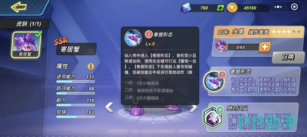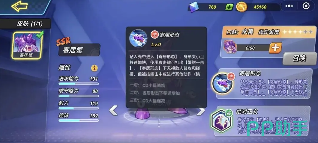 除了技能之外,寄居蟹的成长也是很关键的。提升等级,能让它变得更强,特别是20级之后。要玩好寄居蟹,提升它的等级是必须的,升级之后它的技能也会更强。升级的材料其实挺难弄的,橙子和菠萝这些材料获得的途径不算多,基本上就是靠食物召唤或者排位赛里掉落。不过,排位赛还是挺好获取这些材料的,每次排位都会掉3个果核,还有金币。而食物召唤每天也能通过看广告获得一些果核,大家如果玩寄居蟹,可以试着多打排位,也能顺便提升等级。