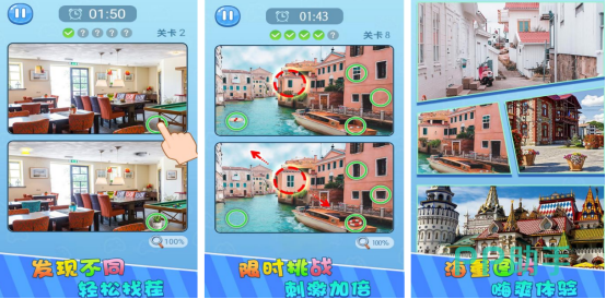 由海量精美图片组合而成,比如可看到装修特别豪华的客厅,或者是各种精美的小宠物等等。闯关时将会看到屏幕上下两方有极度相似的图片。粗略一看,图片特别相似,并没有任何差异,但如果仔细寻找的话,就会发现其中有五处不同的地方,而每个关卡都有时间的限制,需在两分钟之内将所有隐藏比较深的不同之处全部找到。