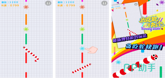 简约的游戏画面中可看到一条色彩斑斓的小蛇,白色和红色相间,在蛇射合理走位的过程当中有各种各样的障碍物,比如会有红色的栏杆或者是绿色的障碍物等,大家手指滑动屏幕。跨越这些障碍物,直接将游戏场景中的各种美味食物,或者是各种花朵全部吞噬之后,就会让自己变得越来越快。