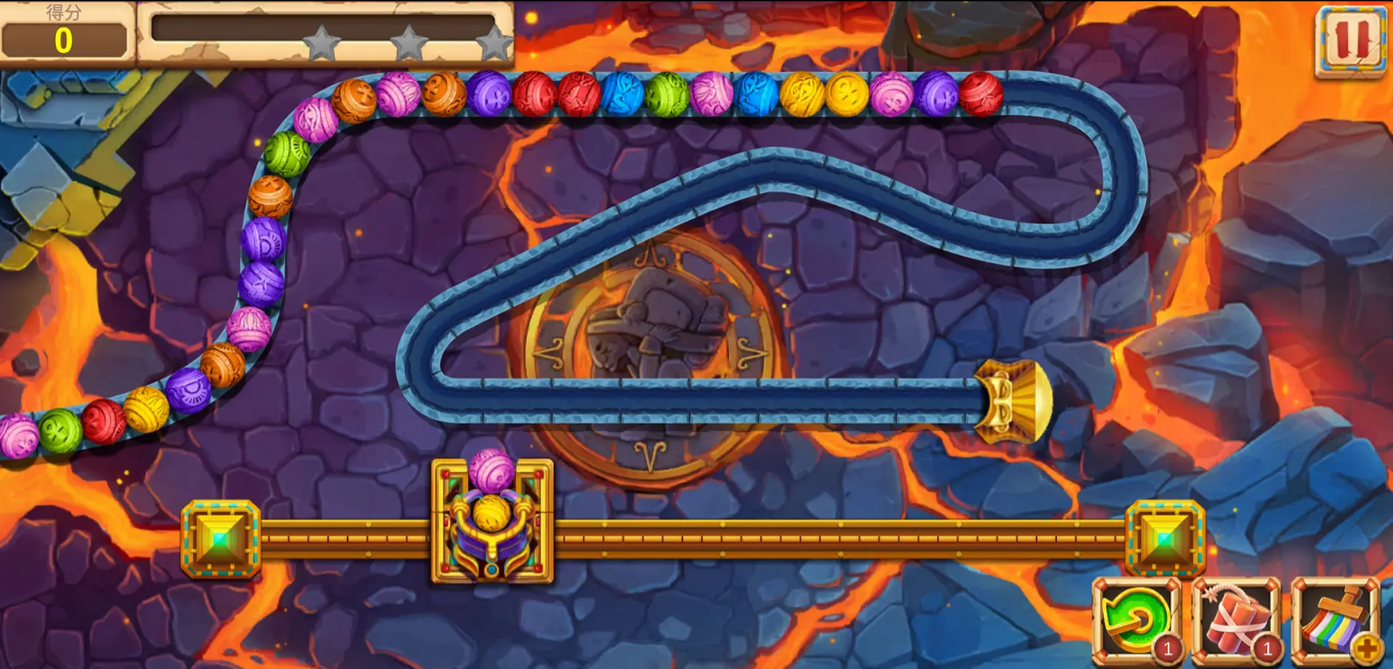游戏中拥有各种不同颜色的祖玛球,玩家需要对祖玛球的顺序进行调整,使三个相同颜色的祖玛球能。能够连接在一起,然后发射出去,就可以将这三个祖玛球进行消除,游戏的最终目的是将轨道上的所有祖玛球全部消灭掉。在这个过程中会有一个洞在轨道上来回的穿梭,需要控制自己的祖玛球不掉入这个洞中,才能够完成相应的任务。