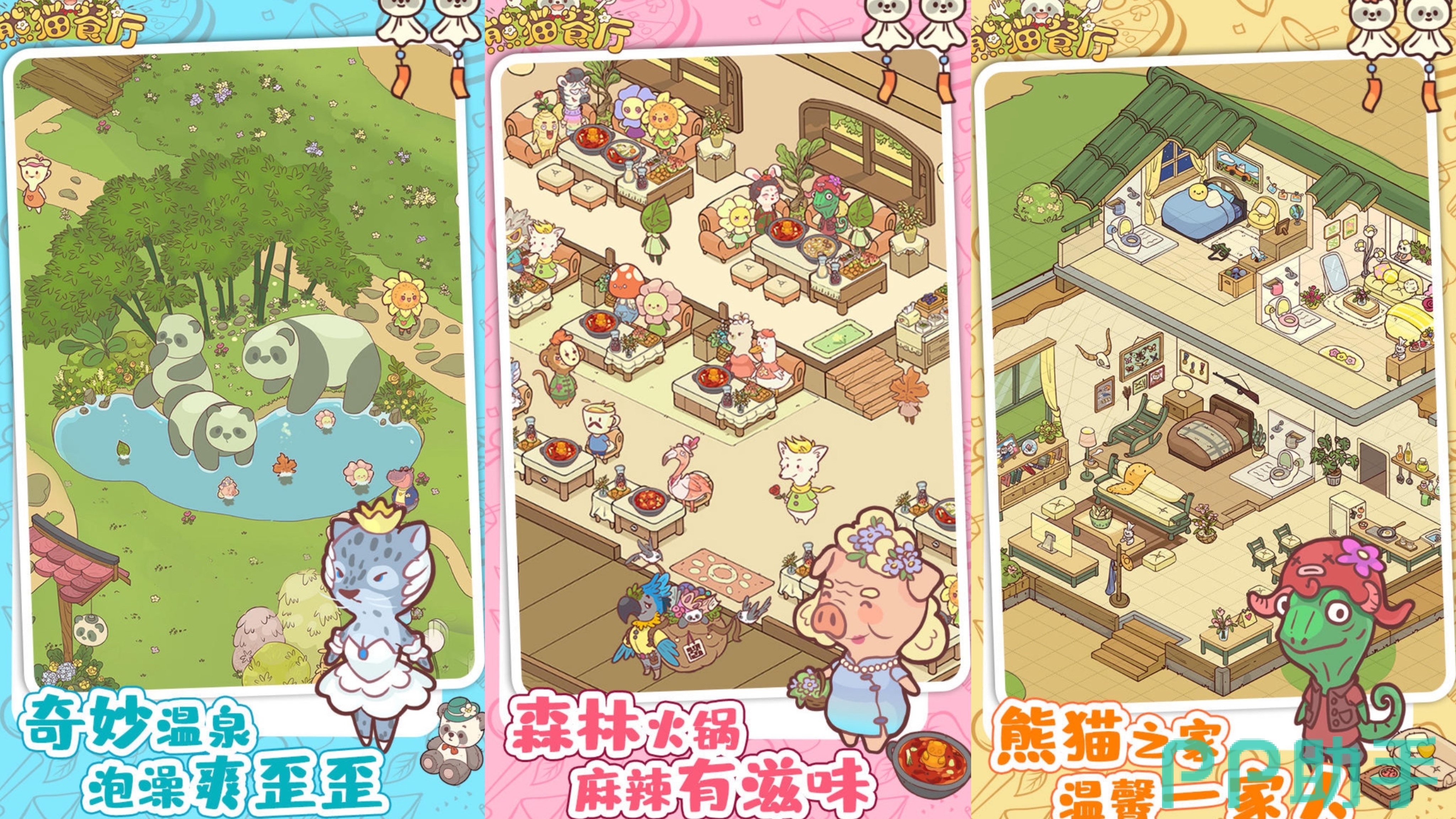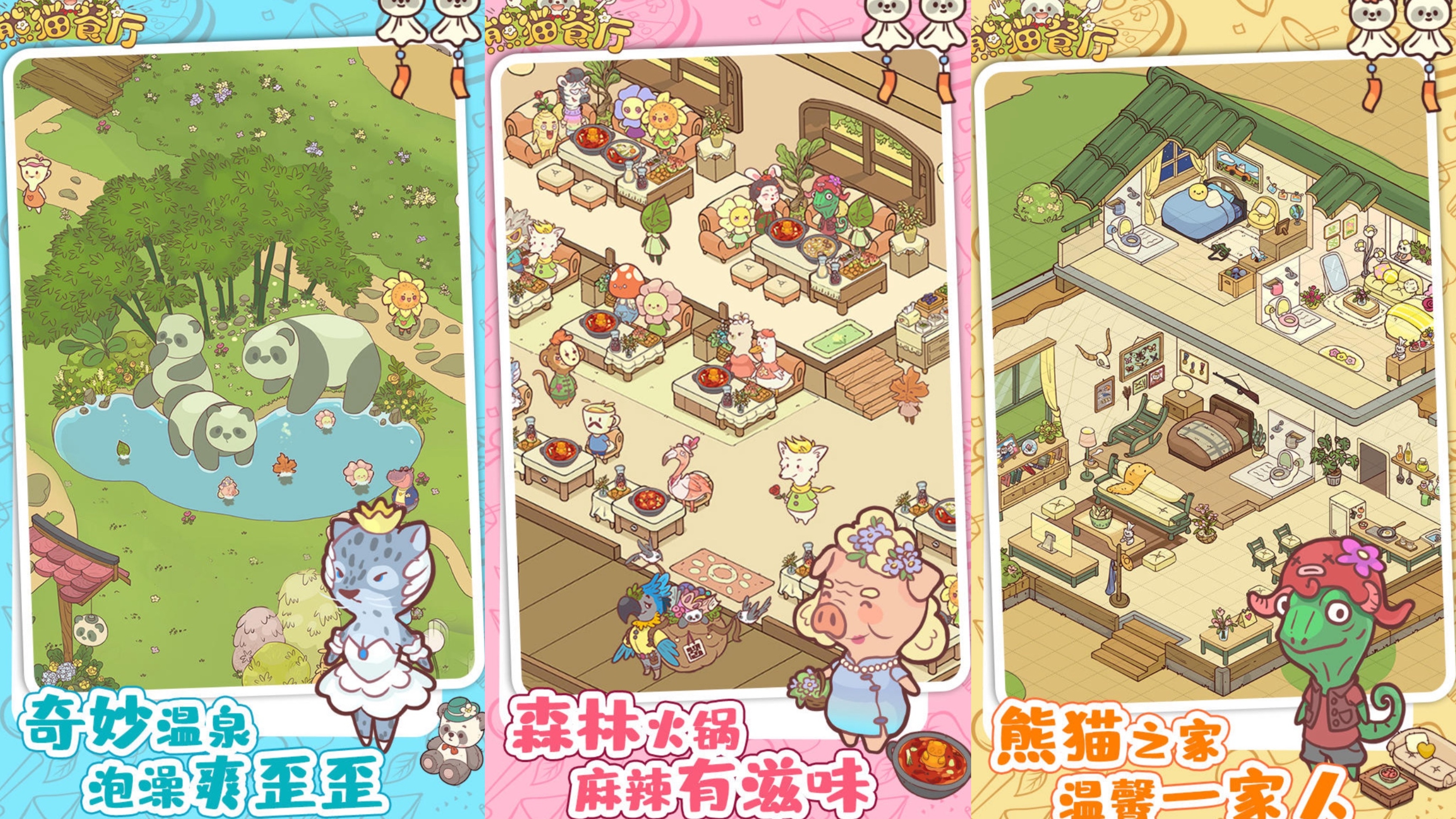 《熊猫餐厅》是一款画风特别软萌的熊猫养成经营手游。游戏是暖色系,所有的角色看上去都特别软乎乎的,特别的舒服好看。在游戏中我们是一个会做饭的小熊猫,每天都做着可口的食物去招待各位顾客,同时还要去不断研发新的特色菜,为我们的店铺招揽更多的食客,获得更多的金币奖励去开分店。而且餐厅的二楼还有酒店需要我们解锁,还有各种店铺装饰,让我们的餐厅越来越高级,越来越整洁漂亮!