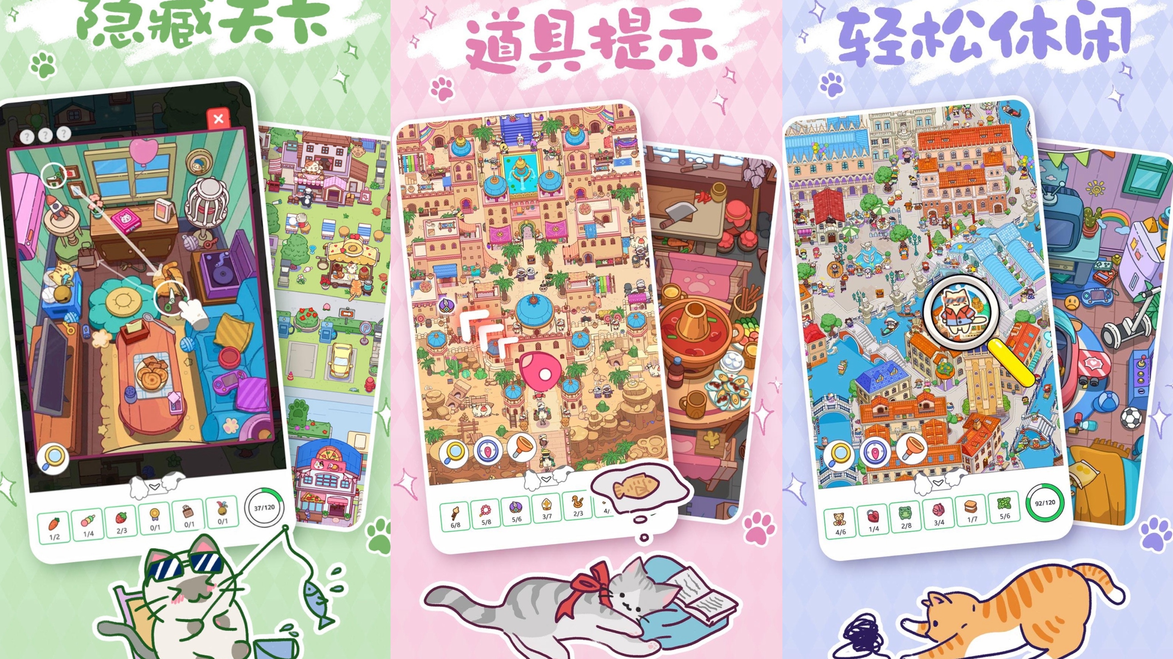 《疯狂找东西》是一款非常好玩的小东西游戏。游戏里有各种各样憨态可掬的小猫咪们,它们会和我们一起在五花八门的场景中开启寻宝之旅。游戏里的场景设计都非常的有趣,而且主题分明,从公园海滩,到冰雪奇缘,每一个场景都会让你感受到不一样的寻宝体验。游戏的玩法就是在限定的时间内找到图中隐藏的宝藏,这对于我们的眼力和耐心是个非常大的考验。另外,随着游戏进度加深,寻宝的难度也会增加,大家快来试试吧!