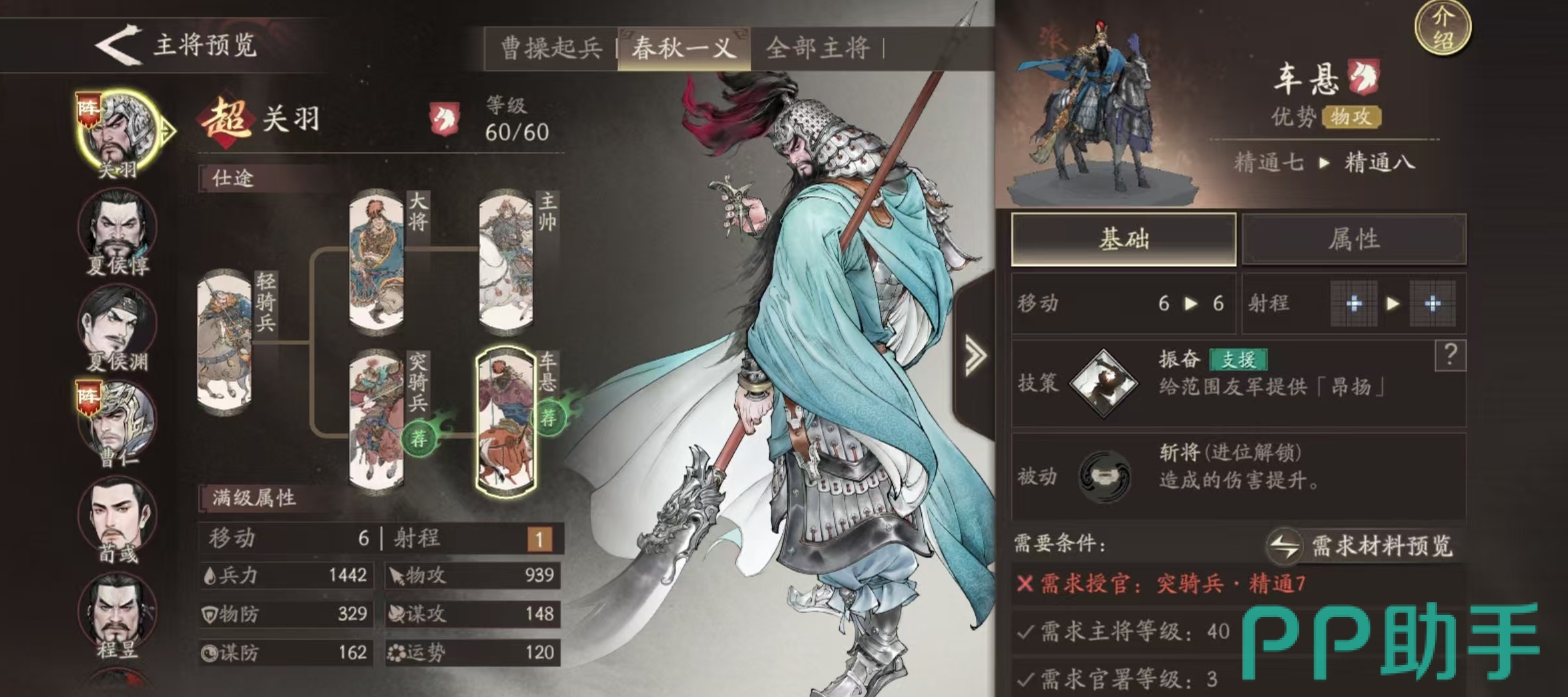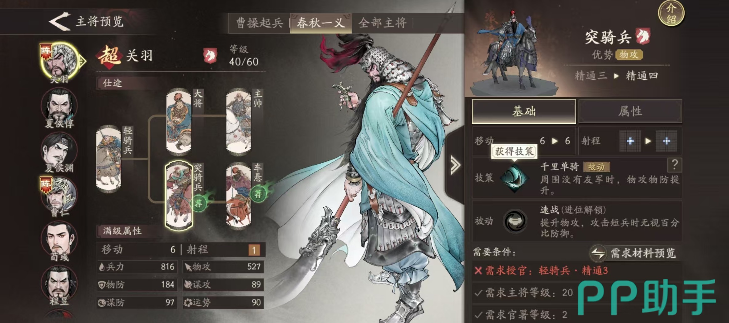 关羽是一位属性极为全面的顶级武将,统帅、武力与魅力三项基础值接近满格,智力和政治也表现优异,堪称接近六边形战士的存在。在角色成长过程中,职业选择尤为关键。推荐优先转职为突骑兵,再进阶至车悬流派,这是当前版本中主流且强度较高的玩法体系。初始转职为突骑兵后,可解锁被动技能“千里单骑”,效果为:当关羽周围一圈没有其他我方部队时,自身物攻与物防提升10%;若武魂层数达到2层,则攻防属性额外再增加5%,极大增强单兵作战能力。