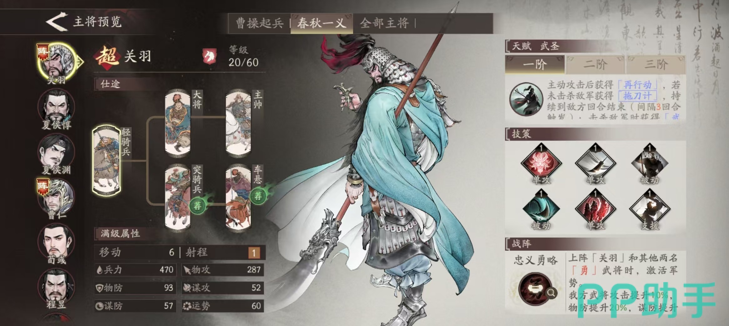 综上所述,关羽在《三国望神州》中定位为高机动性的再动型单体输出将,采用突骑兵→车悬的职业进阶路线,并搭配“青龙斩月”与“拖刀”等核心计策,能够充分发挥其持续作战与精准打击的优势,是目前最适合该角色的成长方案。