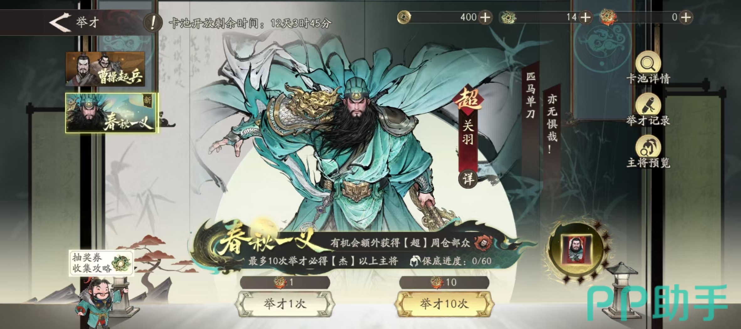 在《三国望神州》这款策略手游中,关羽作为人气顶尖的武将之一,只能通过限定卡池“春秋一义”抽取获得,因此其培养路径备受玩家关注。许多新人玩家都在询问:三国望神州中关羽适合走什么职业路线?当服务器开放相关卡池后,成功招募到关羽只是第一步,如何高效养成才是决定战力的关键。