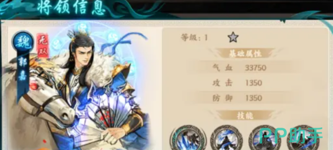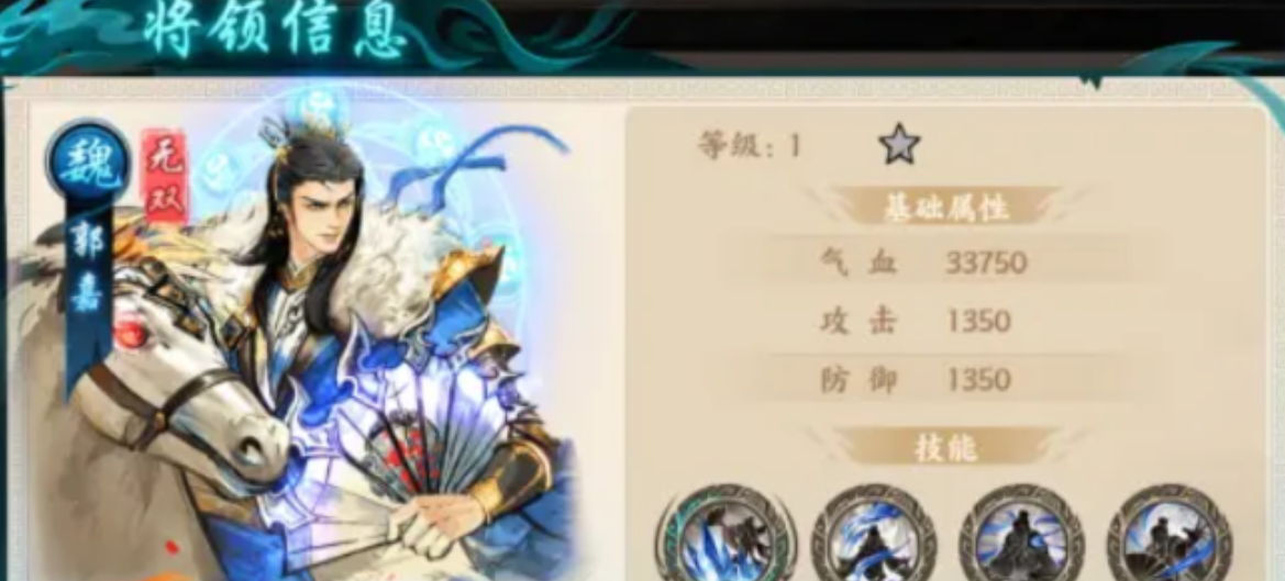郭嘉是控制敌人并且配合寒冰效果很好的一个武将。郭嘉的“地泉鲸浪”技能可以对敌方所有主将造成伤害,有60%的概率给带有寒冰效果的敌人加上3秒的冰冻效果,使敌人不能行动。此技能使郭嘉在多人才斗中表现出色,可以很好地限制住敌方的重要人物,改变战局的发展。觉醒技能“冰天雪地”解锁后,郭嘉的控制力大大提升,“地泉鲸浪”除了可以给敌人造成伤害外,还可以在敌人没有寒冰状态的时候有50%的概率使敌人被冰冻。郭嘉的被动技能在场上出现敌人被挂上寒冰的时候,会对敌人造成额外伤害并且施加1.5秒的冰冻效果,使敌人更加困扰