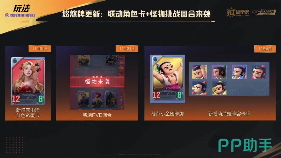 同时也有悠悠牌更新,联动角色卡加上怪物挑战回合一起来袭,11.21日,悠悠牌即将上心爱宋雨琦红色彩蛋卡,新加入了PVE回合,怪物来的时候,己方队伍是不是能获取最终胜利,12.6日,该玩法也加入了葫芦小金刚、葫芦娃阵容卡牌。