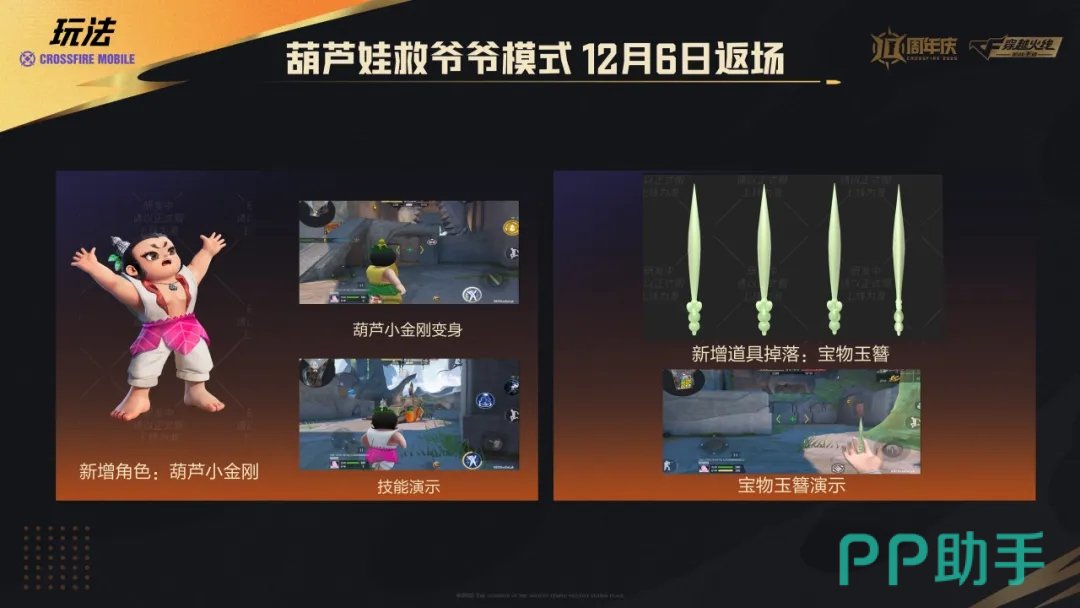 当然那还有”葫芦娃救爷爷模式”在12月6日返场,这个玩法正式在当天返场,新增了葫芦小金刚这个角色,还有新增道具会掉落,就是宝物玉簪,童年的快乐是不是又回来了;自然是有葫芦娃经典道具可以重温,M14EBR-葫芦山庄、葫芦娃武器、蛤蟆变变器在对局都可再次获得。