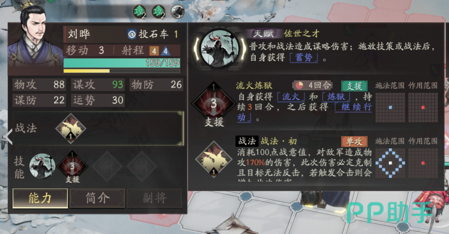 游戏当中的刘晔他在技能效果上面,大家可以看到的一个技能是叫做流火这个被动,这个被动也相当于是他的一个核心效果,触发流火的话可以将物攻的35%增加到魔攻上面,而且在刘晔造成了普攻之后,还可以根据他的普攻从数值带来物理伤害转化为谋略伤害的数值效果,并且此类的效果是不可清除的,所以他在有流火状态进行加成的情况下,这个角色绝对是非常强的,除了这个被动作为的一个核心效果之外。