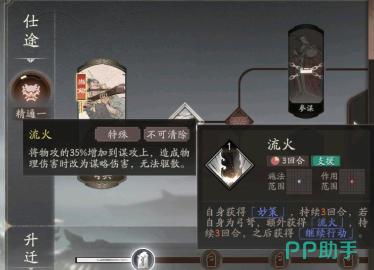 但是其实后面的效果是一样的,多一个前面的35%转换可能其他的物理类型武将,大家认为也会有流火技能的时候,就能享受到后面的谋略伤害,但是其实在没有此类武将进行搭配的时候,他的能力上面相对来说是比较特殊的,那么这里因为有流火带来的谋攻效果之后,他自身还可以获得一些妙策的能力,可以带来足够的提升,这类效果是可以给此类谋士角色带来足够多的伤害,而且持续回合最多的情况下,他的技能可以持续3个回合来进行生效。