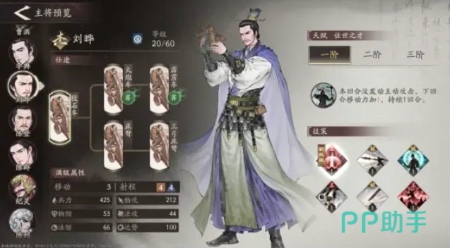 所以相对来说,流火是此类武将的一个通用buff能力,大家如果想要用刘晔的话,还要记住后期在成长路线上面,刘烨一般来说都是通过兵营系统来进行职业转换的,目前如果大家玩儿他的话,建议是走弓兵路线是更适合他的,因为这个路线的话,跟他的基础属性上面契合度会比较高,而且根据他的射程优势,以及后期技能上面可以造成的攻移高移速效果来判断的话,在弓兵体系当中他的能力是有更大的利用价值,而且他的天赋技能还可以利用这样的职业效果来提升自身的移动速度,所以在战场的机动性上面,通过这类成长路线的话,也可以得到足够多的培养方向。